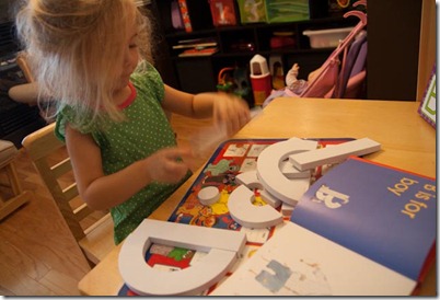 We have the leap frog word builder so I started her on building the (at) words, like hat, bat, mat, ect…